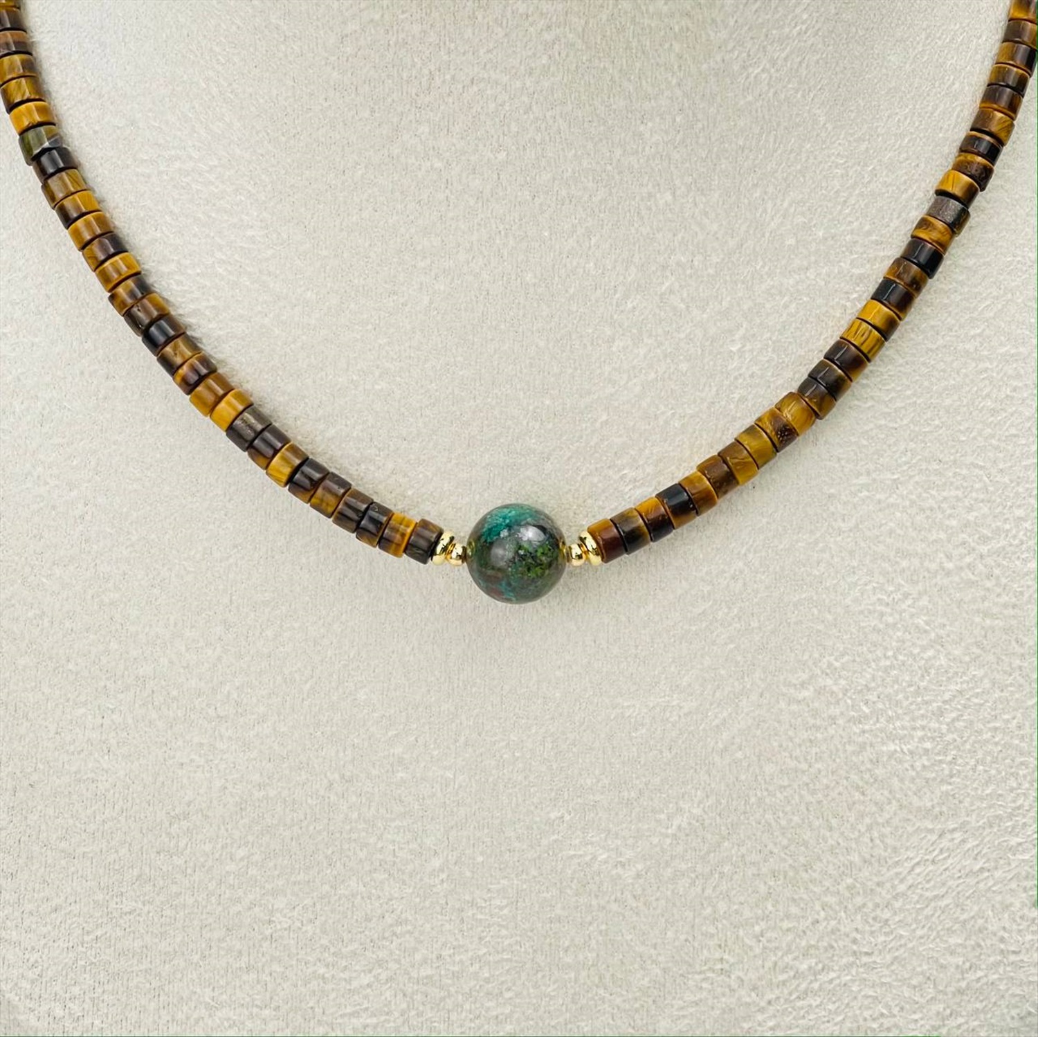 Цвет камня: Миксовый Месторождение: Африка Камень: Тигровый глаз Вставка: Хризоколла Покрытие: Золото 14К Диаметр: 10 мм Поверхность: Гладкий Размер: 2х4 мм Производитель: Радуга Самоцветов (Россия) Тип замка: Карабин с цепочкой Комментарии к товару
