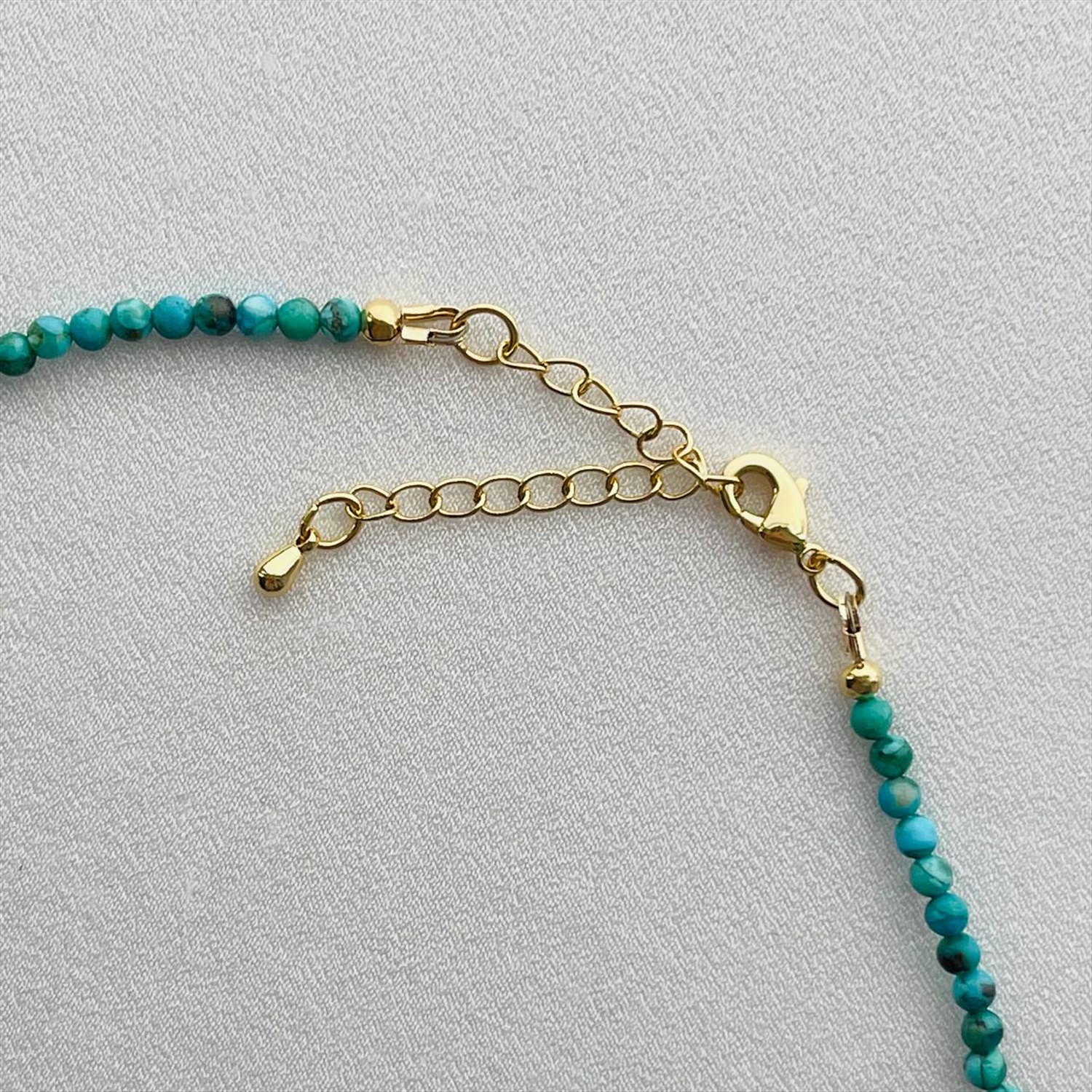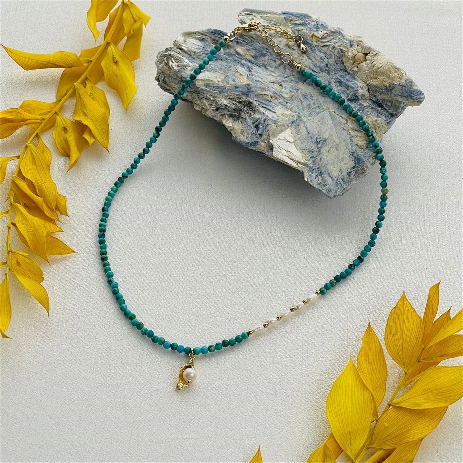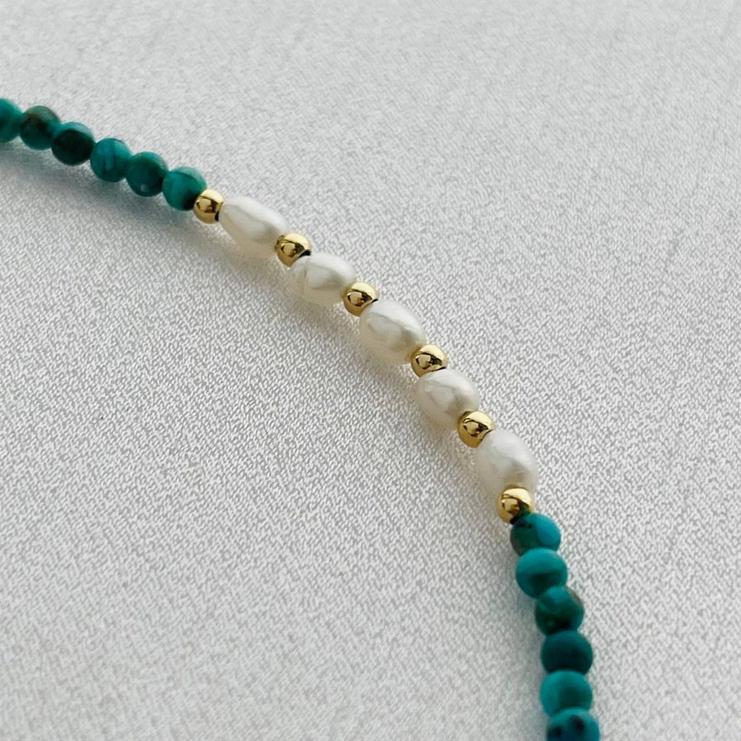 Цвет камня: Бирюзовый Камень: Бирюза Вставка: Жемчуг Покрытие: Бижутерный сплав Диаметр: 3 мм Производитель: Радуга Самоцветов (Россия) Тип замка: Карабин с цепочкой Комментарии к товару