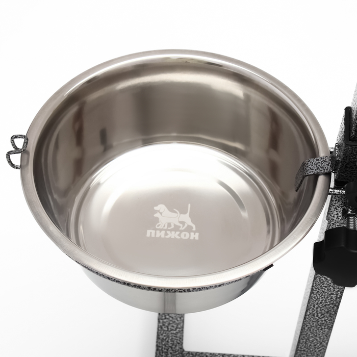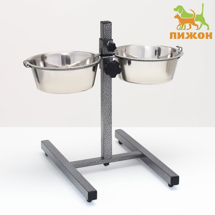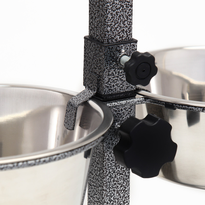 Стойка с 2-мя мисками для кормления сразу нескольких животных, это – идеальное решение для кормления щенков и собак подростков, живущих на одной территории. Качественные, практичные и функциональные миски для собак размещены на регулируемой подставке, которая будет расти вместе с вашими малышами. Винтовая кормушка убережёт помещение от загрязнения кормом и водой. Металлическая конструкция очень устойчивая, поэтому ее очень сложно сдвинуть или опрокинуть даже самым активным щенкам. Стойка и миски хорошо переносят обработку горячей водой, моющими и дезинфицирующими средствами.