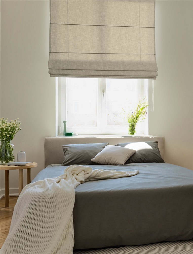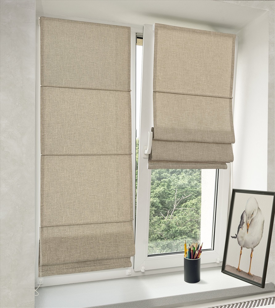 Надежная, функциональная и простая в использовании римская штора мини из однотонной ткани с имитацией под лен. Представляет собой прямое полотно ткани, при подъеме которого образуются горизонтальные складки высотой 17 см, крепится непосредственно к стеклопакету, с возможностью установки без сверления на поворотно-откидное окно. Универсальный цепочный механизм позволяет легко изменить положение (правое или левое) и обеспечивает плавный подъем (опускание) шторы.