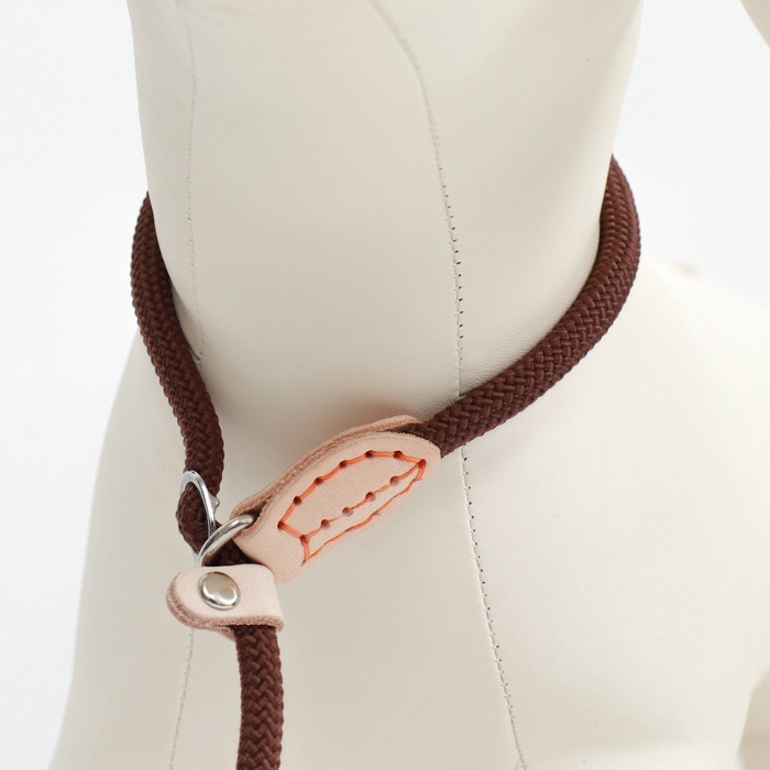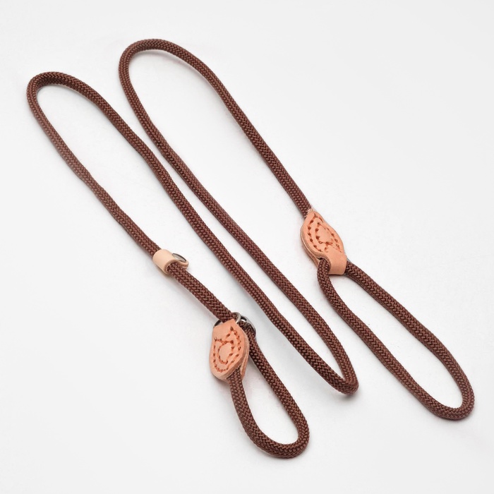 Поводок-удавка изготовлен из полиэстера, данный материал очень прочный. В свою очередь натуральная кожа придает поводку надежность, привлекательный внешний вид и устойчивость к истиранию при использовании поводка на протяжении продолжительного времени.