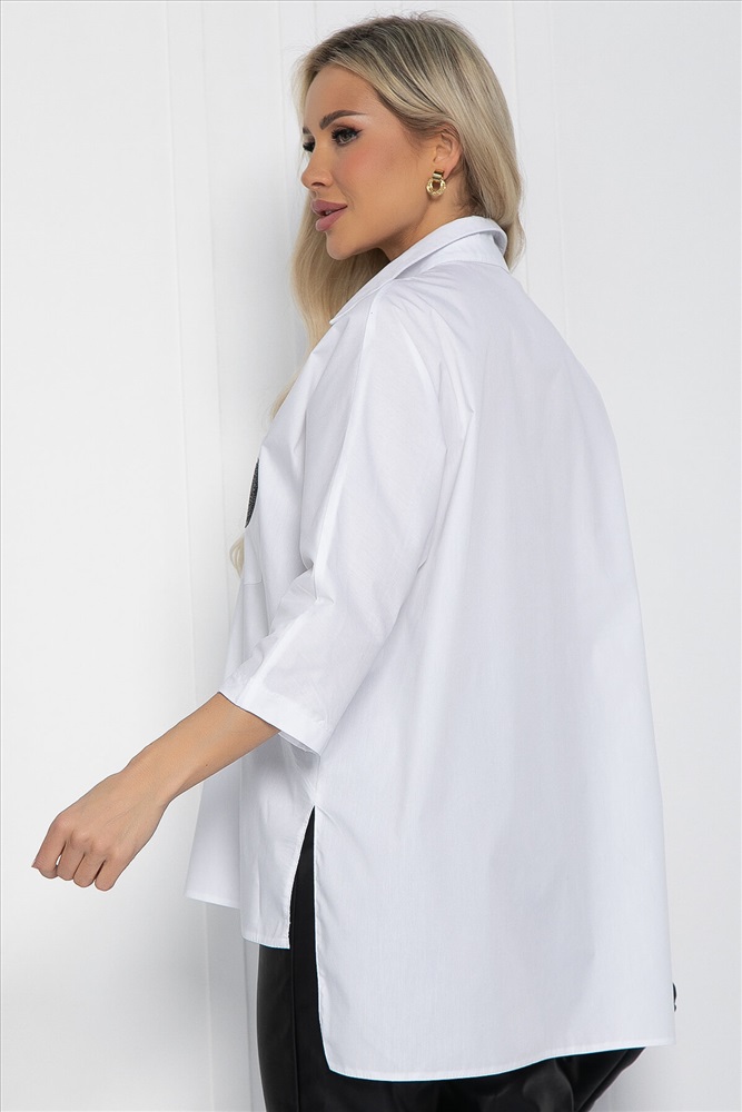 Тип ткани: натуральная. Состав: 95% хлопок, 5% эластан. Материал: хлопок. Цвет: белый. Принт: отсутствует. Вид застежки: пуговицы. Силуэт: свободный. Карманы: отсутствуют. Подкладка: отсутствует. Декоративные элементы: черные карманы. Длина по переду (ассиметричный крой): 44/ 65 см, 46/ 66 см, 48/ 68 см, 50/ 69 см, 52/ 71 см, 54/ 72 см. Длина по спинке от верхней точки плеча: 44/ 71 см, 42/ 72 см, 48/ 73 см, 50/ 74 см, 52/ 75 см, 54/ 76 см. Размер изделия на модели: 44 Рост модели: 168 см. Рубашка из хлопка со стойкой-воротником - это идеальное решение для повседневного гардероба. Удлиненный фасон делает стильный и современный вид, при этом прекрасно скрывая все недостатки фигуры. Это великолепный выбор для тех, кто предпочитает оригинальность и стиль в своем аутфите. Уход за изделием: ручная стирка до 30 градусов; нельзя отбеливать; отжим запрещён; гладить при t не более 110 С; гладить с изнанки. Внимание! Рекомендуем ориентироваться на размерную сетку и выбирать свой привычный размер, согласно размерной таблице. *Допуск отклонения длины при массовом производстве 1-3 см является нормой. Комментарии к товару