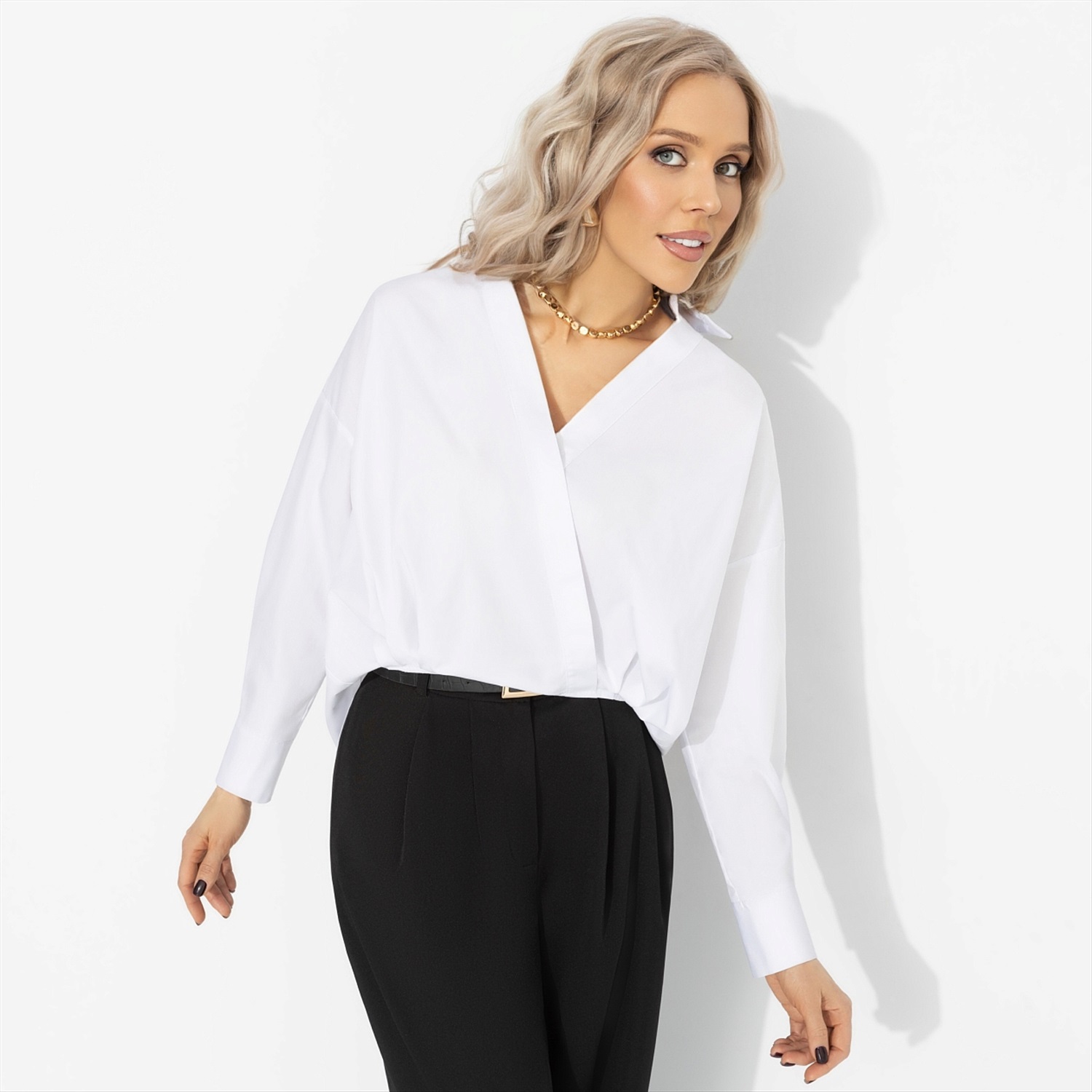 Выбирая новый образ от ЧАРУТТИ, ты сама решешь, как пройдет твой день. Стильная рубашка с имитацией запаха, и офисный look превращается в эффектный выход. Натуральный хлопок дышит, поплин тиси держит четкую геометрию, а драпировка добавляет индивидуальности – всегда на твоих условиях. Рубашка свободного кроя, слегка укорочена.