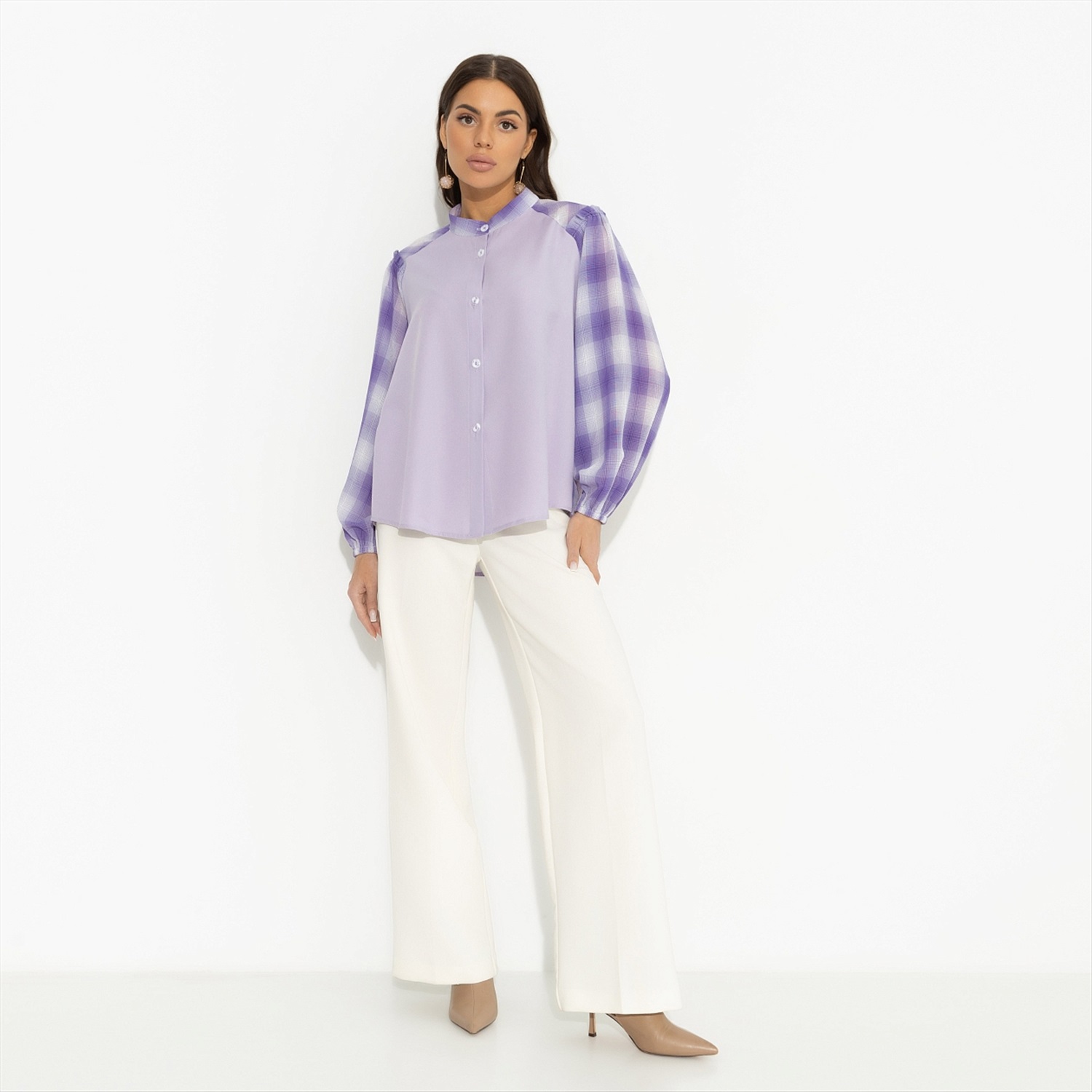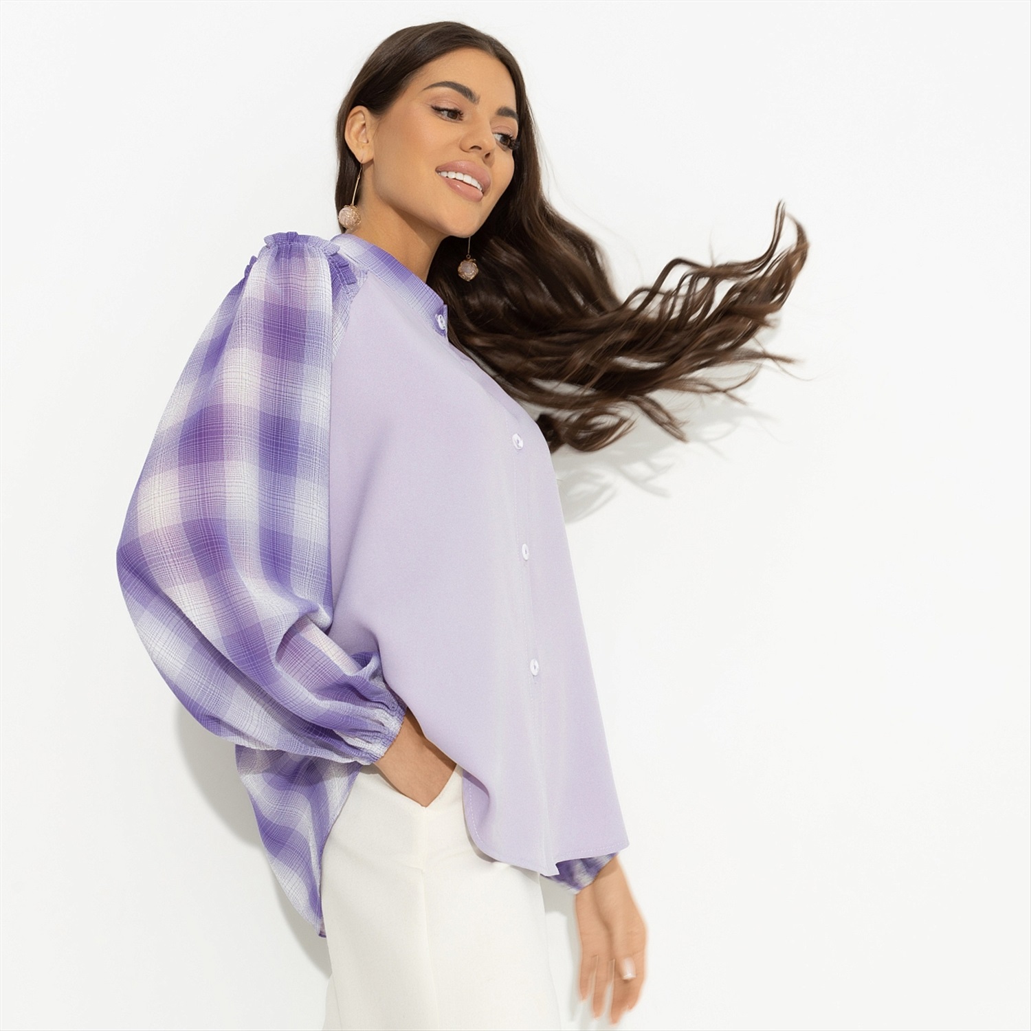 «На сиреневой луне ты забудешь обо всем…», – поет непревзойденный Леонид Агутин. Ты уже знаешь наизусть его песни и готовишься встретиться лично. Конечно же, на его концерте. Блуза CHARUTTI как логичное дополнение к вечному хиту. Блуза свободного силуэта. Рукав свободный, оформлен тонкой резинкой. Изделие застегивается на пуговицы. Деликатные рюши на плечах блузы в качестве декора.