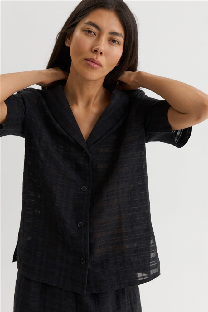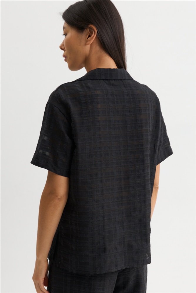 Состав: 85% Вискоза 15% Нейлон Длина: 70 см. Цветовая гамма: Черный Силуэт: Свободный Принт: Нет Коллекция: Лето #4 Базовая рубашка с характером из фактурной вискозы. Модель свободного силуэта с английским воротником. Спущенная линия плеча, короткий рукав. В боковых швах разрезы. Застежка на петли и пуговицы. Комментарии к товару