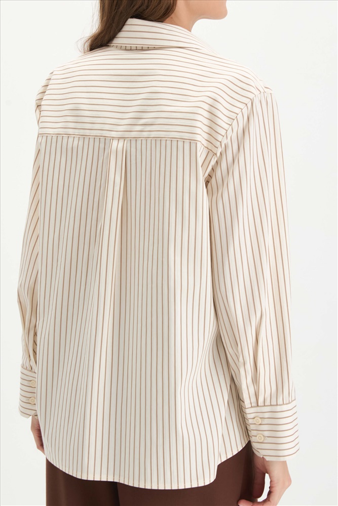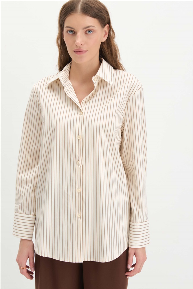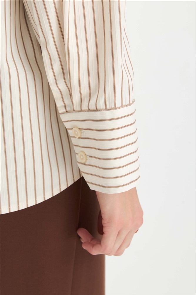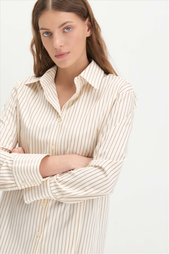 Состав: 95% хлопок 5% эластан Длина: 72 см. Цветовая гамма: Молочный/полоса Силуэт: Свободный Принт: Да Коллекция: Весна #1 Рубашка из хлопкового полотна в полоску. Модель свободного силуэта. Рубашечный воротник. Рукав прямой слегка спущенный, на широком манжете. Комментарии к товару