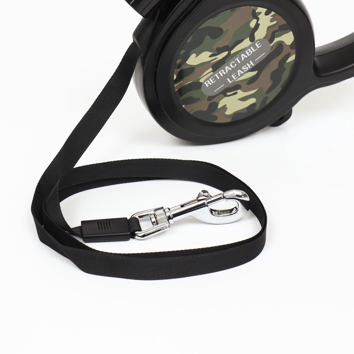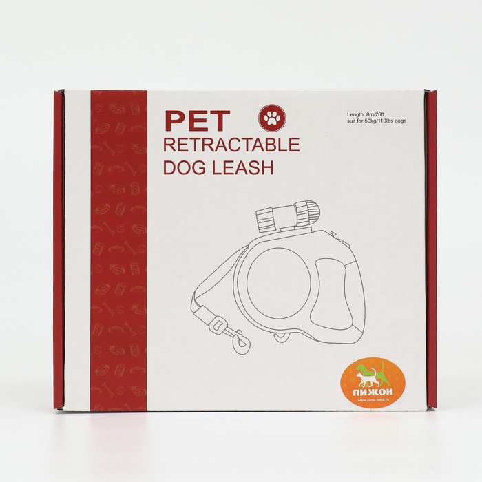 Лента рулетки имеет длину 8 метров и выдерживает вес до 50 кг, что позволяет использовать ее для больших и средних пород собак.