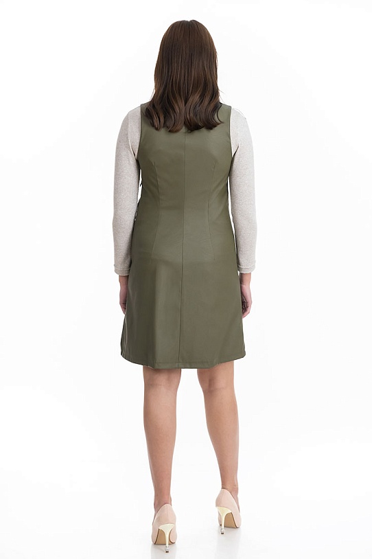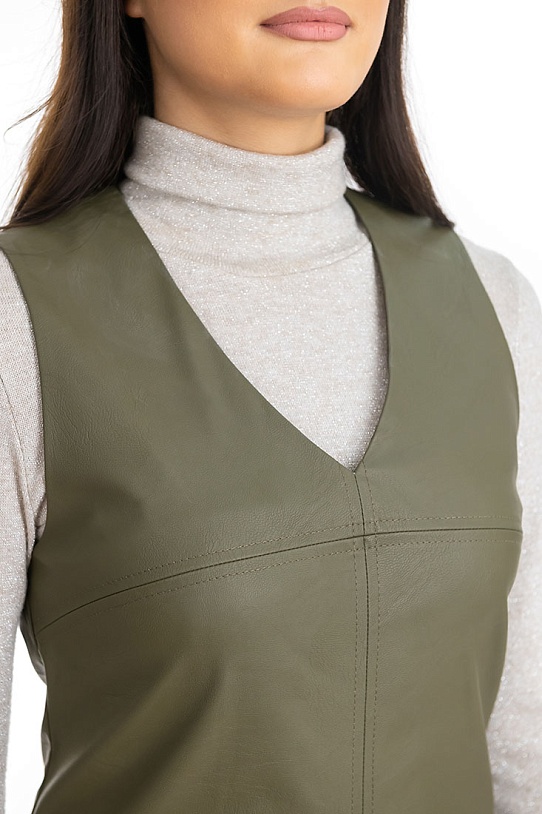 описаниеСарафан силуэта трапеция выполнен из экокожи.V-образный вырез. По рельефным швам декоративная отстрочка. В боковом шве потайная молния.
