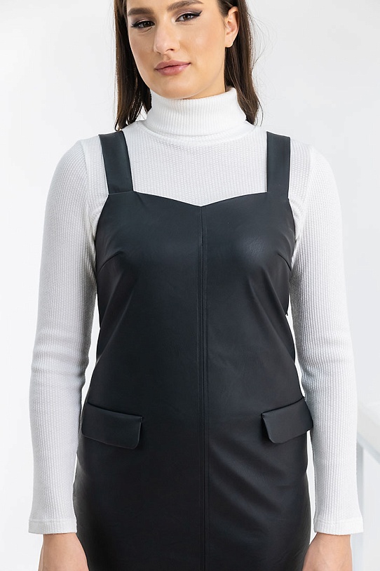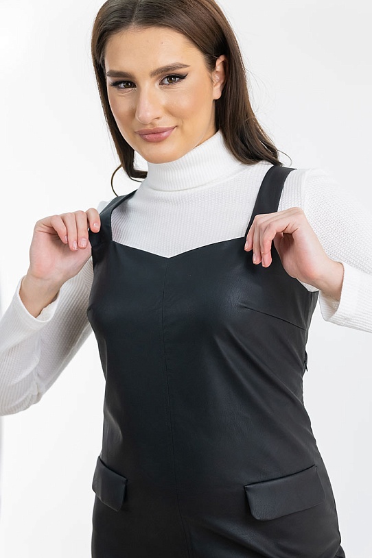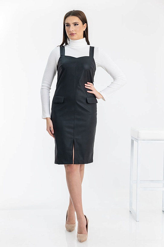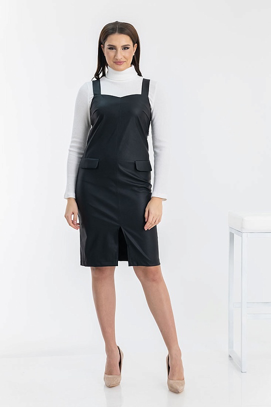 описаниеСарафан на широких бретелях полуприлегающего силуэта выполненный из экокожи. На полочке декоративные клапаны. Потайная молния в боковом шве. По переду разрез.