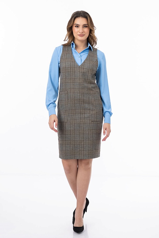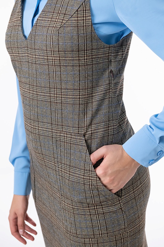 описаниеСарафан на бретелях с V-образным вырезом - основа современного гардероба каждой модницы. Приталенный силуэт сарафана, выполненного из плотной костюмной ткани в клетку, очень мягкой и приятной к телу, создает стильный деловой образ. Вытачки из проймы и потайная молния в боковом шве дают идеальную посадку, Удобные функциональные накладные карманы.