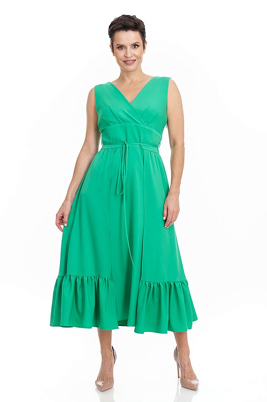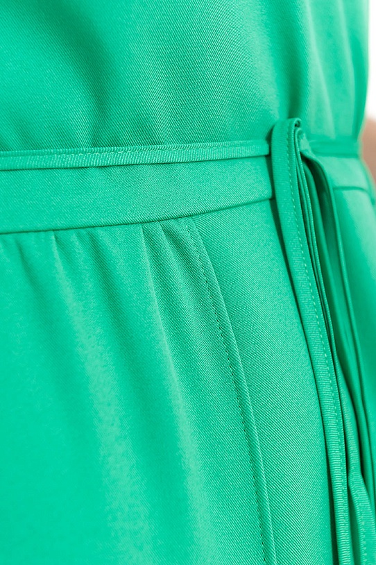 описаниеСильно приталенная, Х-образного силуэта, на талии – деталь – имитация корсета. По центру этой детали есть не большие шлевки для узкого пояса. Застежка на молнии сбоку, V-образный вырез на запах, нагрудный вытачки застрочены на лицевую часть изделия. Юбка – миди, до середины голени. Самый вызывающий элемент платья – глубокий запах на юбке с двух сторон. Фактически юбка состоит из бвух отдельных частей – передней и задней. Глубокий нахлест тканей не позволяет юбке распахиваться до полного неприличия, но выглядит все же максимально смело. По низу задней части юбки широкая рюша.
