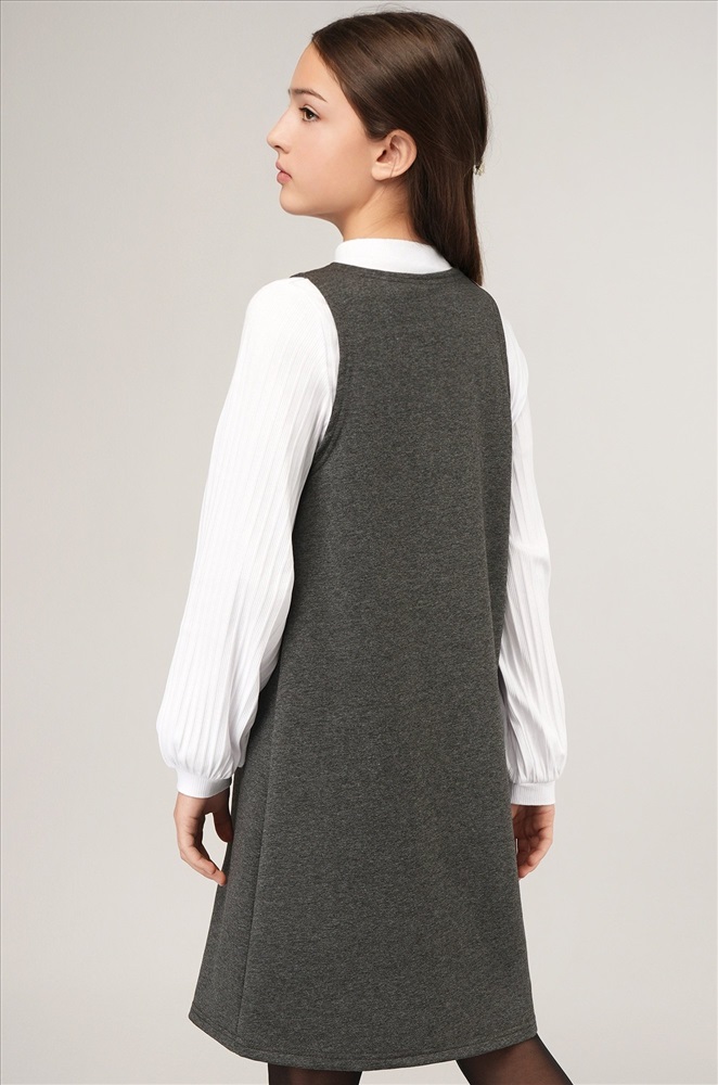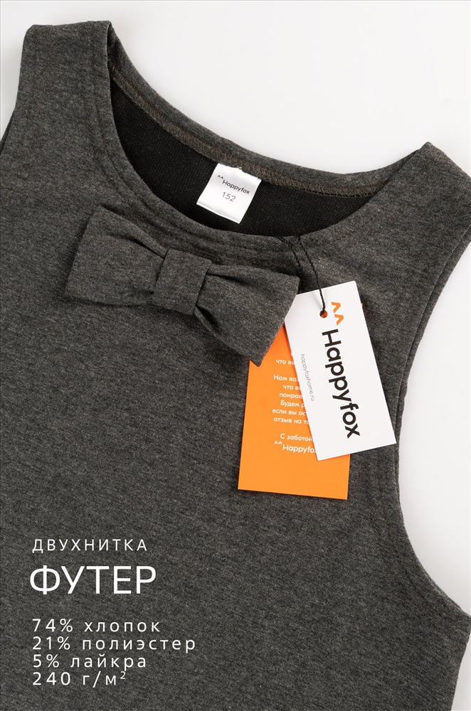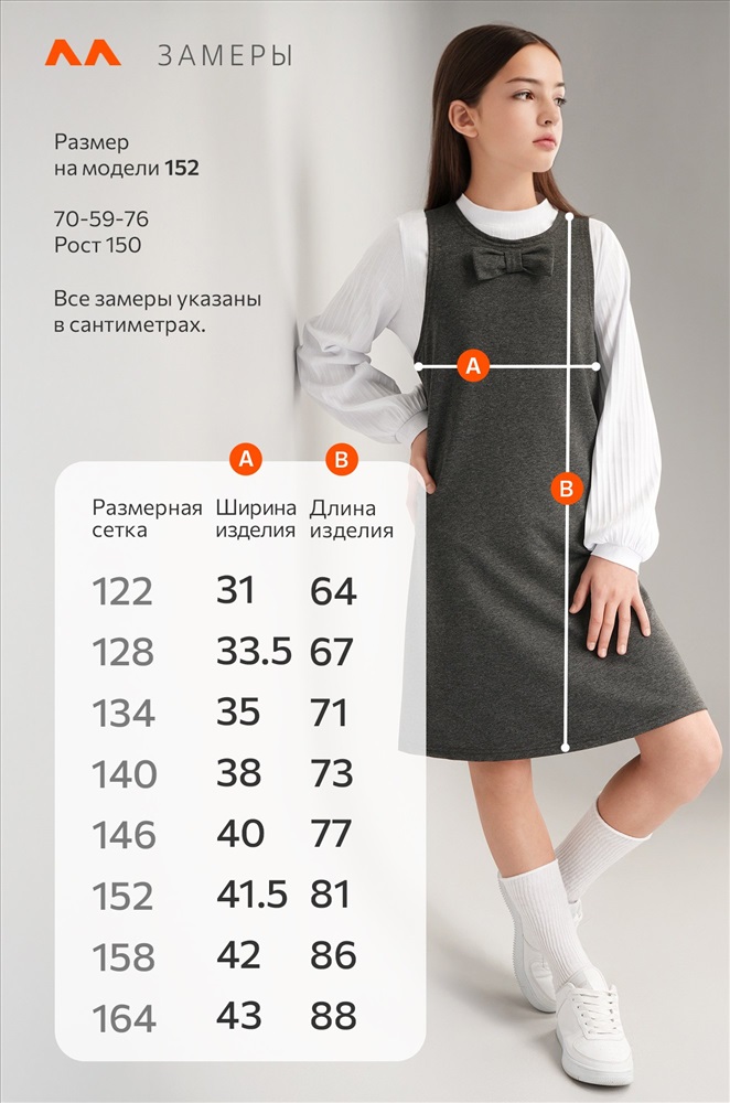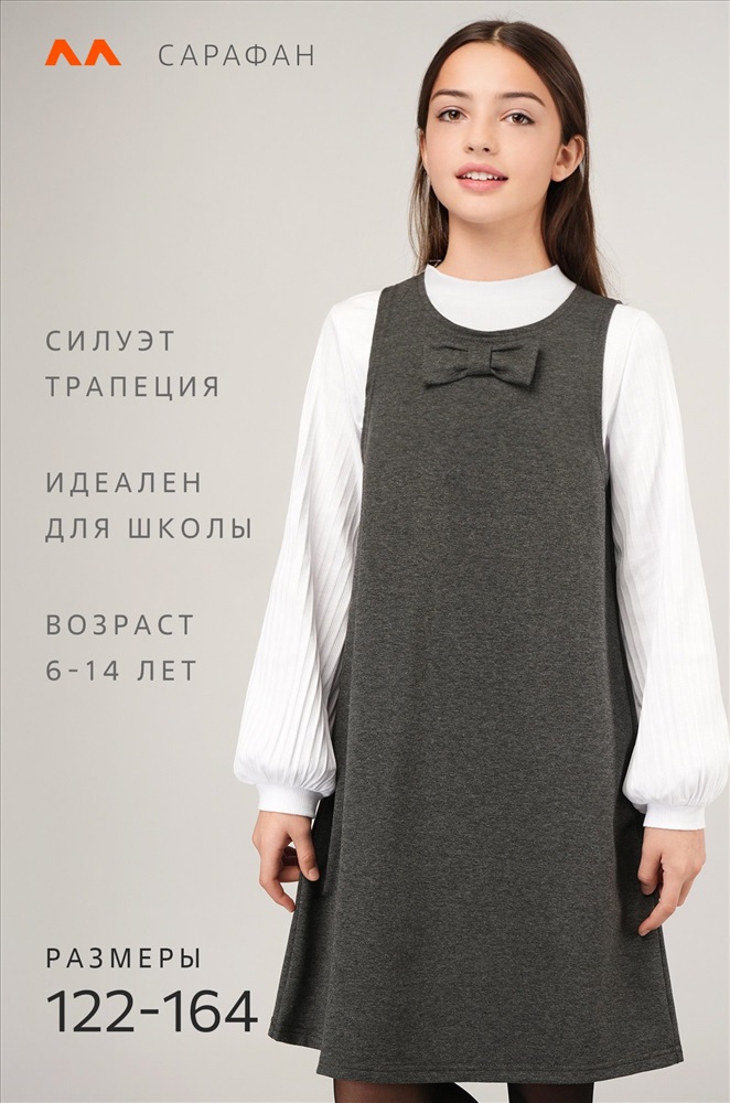 Детский сарафан для девочек и девочек-подростков выполнен из мягкого футера двухнитки. Комфортный силуэт трапеция, длина выше колена, милый бантик – этот серый сарафан для детей точно станет любимым элементом школьной формы и покорит сердца окружающих! Нарядное платье антрацитового цвета выполнено из приятного к телу хлопка. Плотная трикотажная ткань футер делает короткий сарафан идеальным для осенних, весенних и летних дней. Благодаря добавлению полиэстера и лайкры он не вытягивается и сохраняет форму даже после частых стирок. Благодаря свободному крою сарафан из трикотажа не стесняет движений. Аккуратный бантик делает образ сдержанным и опрятным. Хлопковый сарафан графитового цвета станет идеальным решением для школы и праздников. Однотонное платье отлично подойдет для осени, весны и лета. Оно поможет создать праздничный образ для последнего звонка и выпускного! Модель Варвара, рост 148 см, параметры 69-57-73 см. На ней размер 146. Размер 122: длина:64 см; ширина:31 см. Размер 128: длина:67 см; ширина:33,5 см. Размер 134: длина:71 см; ширина:35 см. Размер 140: длина:73 см; ширина:38 см. Размер 146: длина:77 см; ширина:40 см. Размер 152: длина:81 см; ширина:41,5 см. Размер 158: длина:86 см; ширина:42 см. Размер 164: длина:88 см; ширина:43 см. *замеры выборочные, могут незначительно отличаться. Комментарии к товару