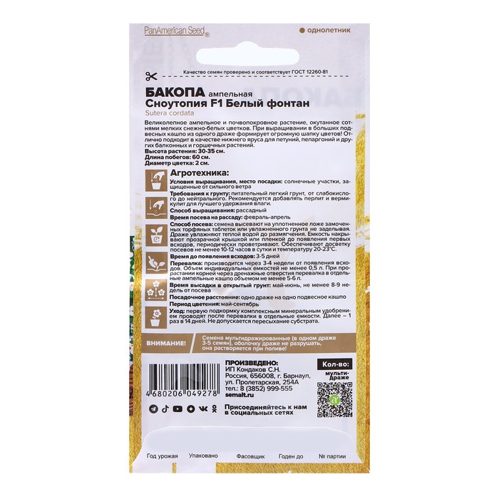 Производитель: Семена Алтая; Габариты: 15 x 8 x 0,5; Страна: Россия; В боксе: 100 шт; Состав: См. на упаковке; Материалы: см. на упаковке; Фасовка: по 10 шт; Индивидуальная упаковка: Без упаковки; Сертификат: Не подлежит сертификации; Цвет: Белый; Размер семян, мм: 1; Количество семян, шт: 3; Агрономический срок годности, лет: 4; Вегетация: Однолетники; Вид: Бакопа; Посев на рассаду: Февраль, Март; Посев (посадка) в грунт: Июнь, Май; Цветение период: Сентябрь, Май, Июль, Июнь; Особенности выращивания: Открытый грунт, Подоконник, балкон; Сухоцвет: Нет; Махровые: Нет; Диаметр цветка (соцветия): 1-2 см; Высота растений: 60-100 см; По форме куста: Ампельная; Назначение: Для создания цветников, клумбы, Для балкона, веранды, Для создания альпийской горки; Отношение к свету: Рассеянный свет; Разновидность: Цветущее; Вид: Россыпь (мелкие); Нуждаются ли в стратификации: Нет
