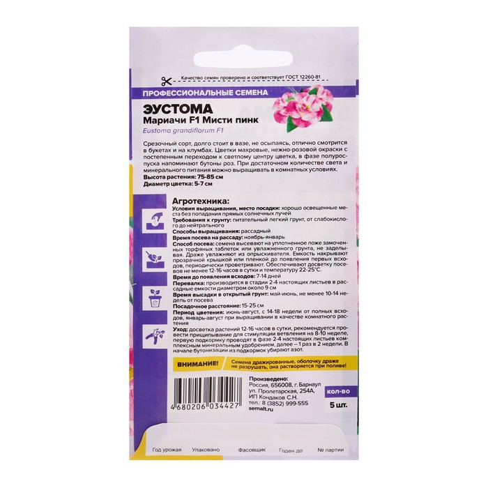 Производитель: Семена Алтая; Габариты: 15 x 8 x 0,2; Страна: Россия; В боксе: 300 шт; Состав: См. на упаковке; Материалы: см. на упаковке; Фасовка: по 5 шт; Индивидуальная упаковка: Без упаковки; Сертификат: Не подлежит сертификации; Цвет: Разноцветный; Агрономический срок годности, лет: 3; Вегетация: Однолетники; Вид: Эустома (Лизиантус); Особенности выращивания: Открытый грунт; Сухоцвет: Нет; Махровые: Нет; По форме куста: Кустовая; Назначение: Для создания букетов, Для создания цветников, клумбы; Отношение к свету: Светолюбивые; Разновидность: Цветущее; Нуждаются ли в стратификации: Нет