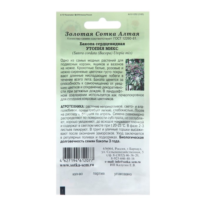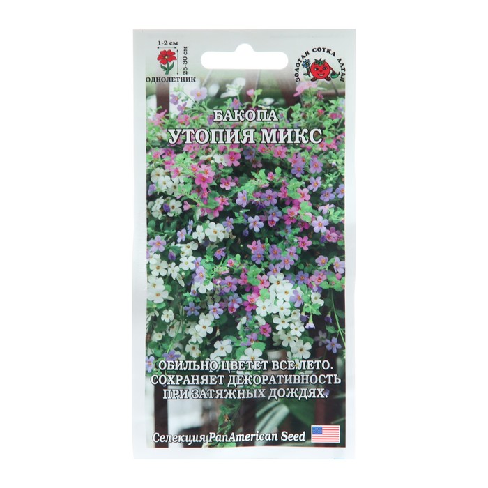 Производитель: Золотая Сотка Алтая; Габариты: 15 x 8 x 0,5; Страна: Россия; В боксе: 400 шт; Состав: Семена; Материалы: семена; Фасовка: по 10 шт; Индивидуальная упаковка: Без упаковки; Сертификат: Не подлежит сертификации; Цвет: Белый, Сиреневый; Вегетация: Однолетники; Вид: Бакопа; Посев на рассаду: Апрель, Март, Февраль; Посев (посадка) в грунт: Май; Цветение период: Июнь, Сентябрь, Август, Июль; Место выращивания: Открытый грунт; Сухоцвет: Нет; Махровые: Да; Высота растений: До 30 см; По форме куста: Кустовая, Ампельная; Назначение: Для создания альпийской горки, Для создания цветников, клумбы; Отношение к свету: Рассеянный свет; Разновидность: Цветущее; Нуждаются ли в стратификации: Нет