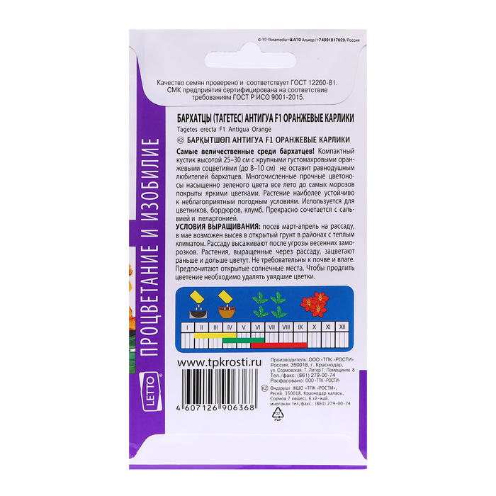 Производитель: Агроуспех; Габариты: 15 x 8 x 0,2; Страна: Россия; В боксе: 200 шт; Состав: Семена; Материалы: семена; Фасовка: по 10 шт; Индивидуальная упаковка: Без упаковки; Сертификат: Не подлежит сертификации; Цвет: Оранжевый; Вегетация: Однолетники; Вид: Бархатцы; Посев на рассаду: Апрель, Март; Посев (посадка) в грунт: Июнь, Май; Цветение период: Июль, Август, Сентябрь, Июнь; Место выращивания: Подоконник, балкон, Открытый грунт; Сухоцвет: Нет; Махровые: Да; Высота растений: До 30 см; По форме куста: Кустовая; Назначение: Для балкона, веранды, Для создания цветников, клумбы; Отношение к свету: Светолюбивые; Разновидность: Цветущее; Нуждаются ли в стратификации: Нет