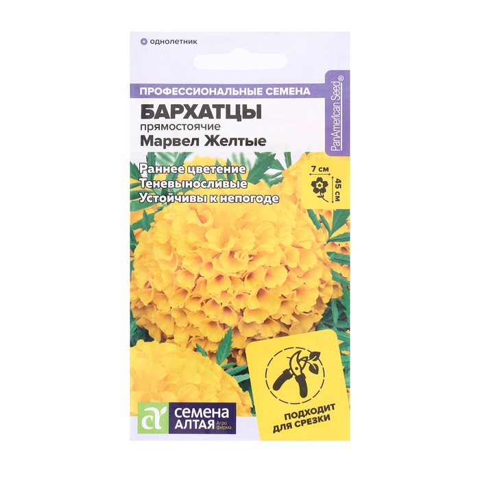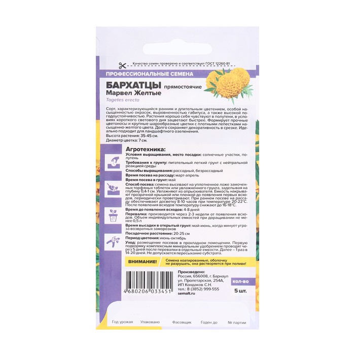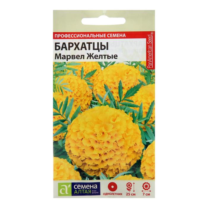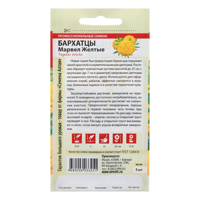 Производитель: Семена Алтая; Габариты: 15 x 8 x 0,2; Страна: Россия; В боксе: 1000 шт; Состав: Семена; Материалы: семена; Фасовка: по 10 шт; Индивидуальная упаковка: Без упаковки; Сертификат: Не подлежит сертификации; Цвет: Жёлтый; Агрономический срок годности, лет: 3; Вегетация: Однолетники; Вид: Бархатцы; Посев на рассаду: Апрель, Март; Посев (посадка) в грунт: Май, Июнь; Цветение период: Август, Июль, Июнь, Сентябрь; Особенности выращивания: Открытый грунт, Подоконник, балкон; Сухоцвет: Нет; Махровые: Да; Высота растений: До 30 см; По форме куста: Кустовая; Назначение: Для создания цветников, клумбы, Для балкона, веранды; Отношение к свету: Светолюбивые; Разновидность: Цветущее; Нуждаются ли в стратификации: Нет