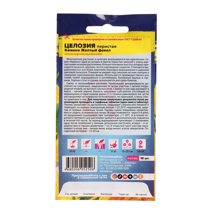 Производитель: Семена Алтая; Габариты: 15 x 8 x 0,1; Страна: Россия; В боксе: 1000 шт; Состав: См. на упаковке; Материалы: см. на упаковке; Фасовка: по 10 шт; Индивидуальная упаковка: Без упаковки; Сертификат: Не подлежит сертификации; Цвет: Жёлтый; Высота, см: 20; Агрономический срок годности, лет: 5; Вегетация: Однолетники; Вид: Целозия; Посев на рассаду: Апрель, Май; Посев (посадка) в грунт: Май; Цветение период: Август, Июль, Сентябрь, Июнь; Особенности выращивания: Универсальный, Открытый грунт; Подходит для балкона: Да; Махровые: Да; По форме куста: Кустовая; Назначение: Для создания цветников, клумбы; Отношение к свету: Рассеянный свет; Разновидность: Цветущее; Вид: Семечки; Нуждаются ли в стратификации: Нет