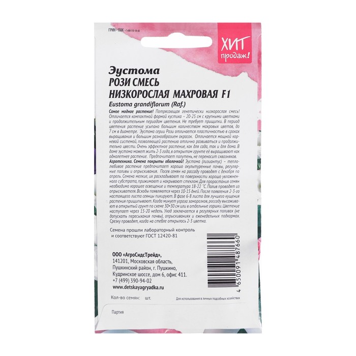 Производитель: Агросидстрейд; Габариты: 15 x 8 x 0,5; Страна: Россия; В боксе: 400 шт; Состав: См. на упаковке; Материалы: см. на упаковке; Фасовка: по 10 шт; Индивидуальная упаковка: Без упаковки; Сертификат: Не подлежит сертификации; Цвет: МИКС; Агрономический срок годности, лет: 3; Вегетация: Однолетники; Вид: Эустома (Лизиантус); Особенности выращивания: Открытый грунт; Сухоцвет: Нет; Махровые: Нет; По форме куста: Кустовая; Назначение: Для создания букетов, Для создания цветников, клумбы; Отношение к свету: Светолюбивые; Разновидность: Цветущее; Нуждаются ли в стратификации: Нет