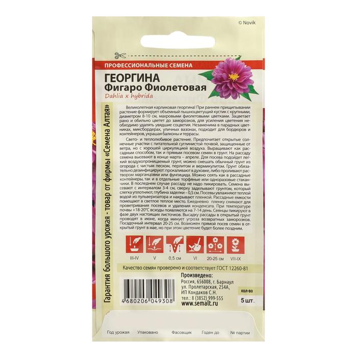 Производитель: Семена Алтая; Габариты: 15 x 8 x 0,1; Страна: Россия; В боксе: 500 шт; Состав: См. на упаковке; Материалы: см. на упаковке; Фасовка: по 10 шт; Индивидуальная упаковка: Без упаковки; Сертификат: Не подлежит сертификации; Цвет: Фиолетовый; Размер семян, мм: 2; Агрономический срок годности, лет: 5; Количество семян, шт: 5; Вегетация: Однолетники; Вид: Георгина; Посев на рассаду: Март, Апрель; Посев (посадка) в грунт: Май, Июнь; Цветение период: Июль, Август, Сентябрь; Особенности выращивания: Открытый грунт; Сухоцвет: Нет; Махровые: Да; Диаметр цветка (соцветия): 9-12 см; Высота растений: 30-60 см; По форме куста: Кустовая; Назначение: Для создания цветников, клумбы; Отношение к свету: Рассеянный свет; Разновидность: Цветущее; Вид: Простые семена; Нуждаются ли в стратификации: Нет; Фиксированная цена: Да