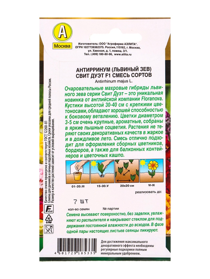 Производитель: Агрофирма АЭЛИТА; Габариты: 15 x 8 x 0,1; Страна: Индия; В боксе: 150 шт; Состав: См. на упаковке; Материалы: см. на упаковке; Фасовка: по 10 шт; Индивидуальная упаковка: Без упаковки; Сертификат: Не подлежит сертификации; Цвет: МИКС; Вегетация: Однолетники; Вид: Львиный зев; Цветение период: Август, Июнь, Июль, Сентябрь; Место выращивания: Открытый грунт; Сухоцвет: Нет; Махровые: Нет; Высота растений: 30-60 см; По форме куста: Кустовая; Назначение: Для создания цветников, клумбы; Отношение к свету: Светолюбивые; Разновидность: Цветущее