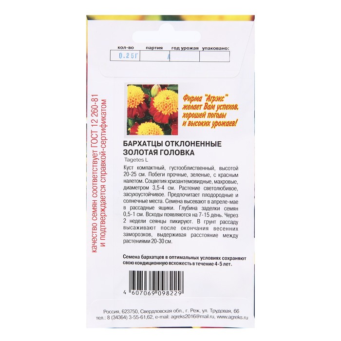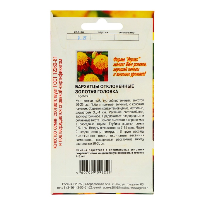 Производитель: АГРЭКС; Габариты: 15 x 8 x 0,1; Страна: Россия; В боксе: 200 шт; Состав: Семена; Материалы: семена; Фасовка: по 10 шт; Индивидуальная упаковка: Без упаковки; Сертификат: Не подлежит сертификации; Цвет: Оранжевый; Вегетация: Однолетники; Вид: Бархатцы; Посев на рассаду: Март, Апрель; Посев (посадка) в грунт: Май, Июнь; Цветение период: Июль, Август, Июнь, Сентябрь; Место выращивания: Подоконник, балкон, Открытый грунт; Сухоцвет: Нет; Махровые: Да; Высота растений: До 30 см; По форме куста: Кустовая; Назначение: Для создания цветников, клумбы, Для балкона, веранды; Отношение к свету: Светолюбивые; Разновидность: Цветущее; Нуждаются ли в стратификации: Нет