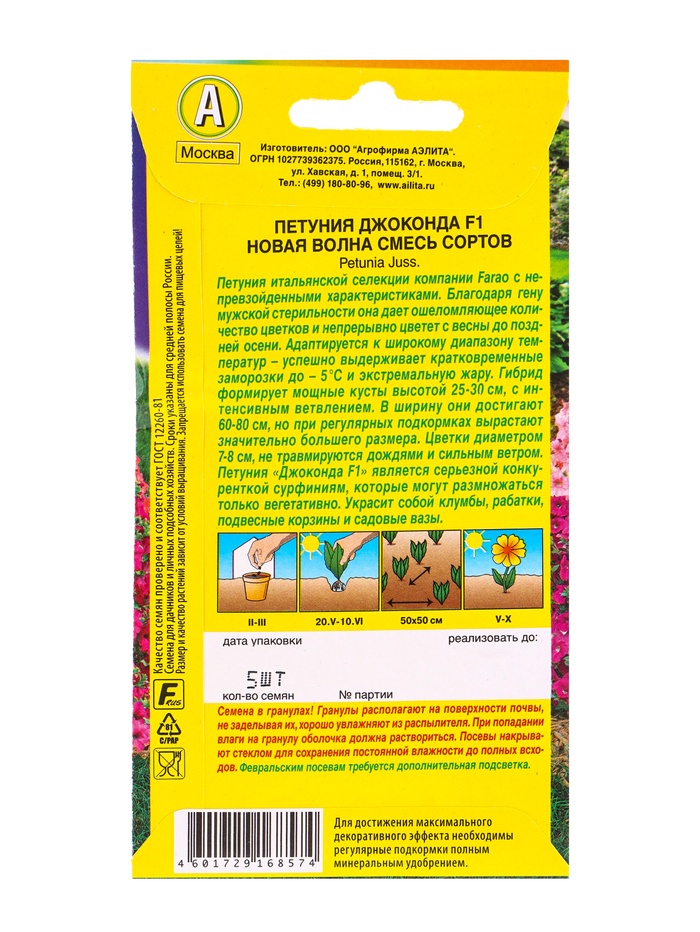Производитель: Агрофирма АЭЛИТА; Габариты: 15 x 8 x 0,2; Страна: Италия; В боксе: 100 шт; Состав: См. на упаковке; Материалы: см. на упаковке; Фасовка: по 100 шт; Индивидуальная упаковка: Без упаковки; Сертификат: Не подлежит сертификации; Цвет: Розовый; Вегетация: Однолетники; Вид: Петуния; Посев на рассаду: Февраль, Март; Посев (посадка) в грунт: Июнь, Май; Цветение период: Август, Июль, Июнь, Май, Октябрь, Сентябрь; Место выращивания: Открытый грунт; Сухоцвет: Нет; Махровые: Нет; Высота растений: 60-100 см; По форме куста: Кустовая; Назначение: Для создания цветников, клумбы; Отношение к свету: Светолюбивые; Разновидность: Цветущее; Нуждаются ли в стратификации: Нет