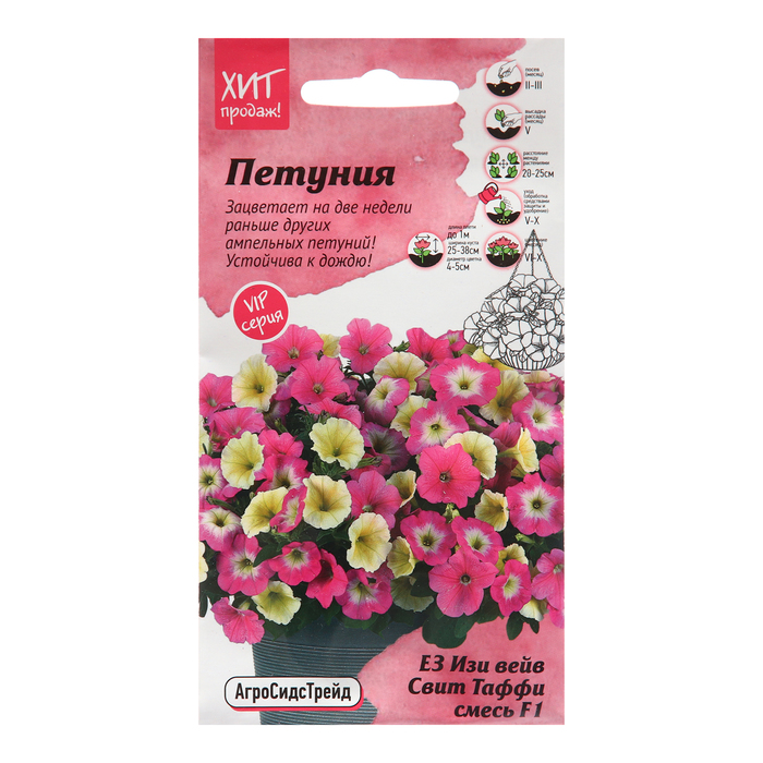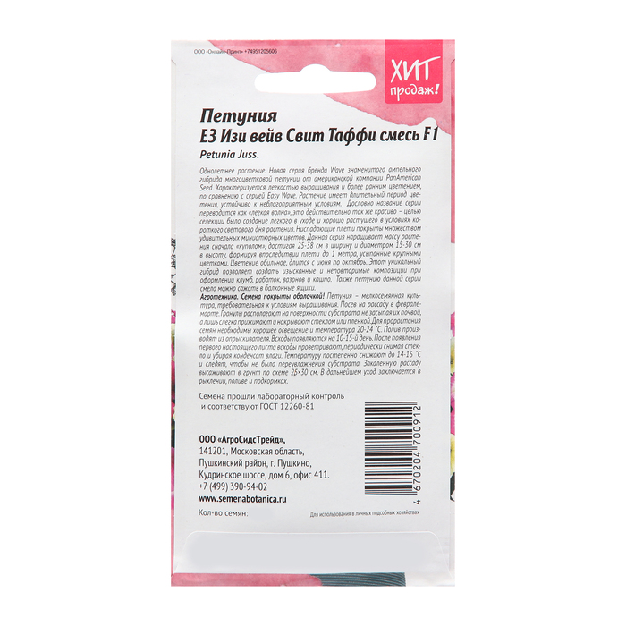 Производитель: Агросидстрейд; Габариты: 15 x 8 x 0,5; Страна: Россия; В боксе: 100 шт; Состав: Семена; Материалы: семена; Фасовка: по 10 шт; Индивидуальная упаковка: Без упаковки; Сертификат: Не подлежит сертификации; Цвет: МИКС; Агрономический срок годности, лет: 5; Вид: Петуния; Особенности выращивания: Открытый грунт; Сухоцвет: Нет; Махровые: Нет