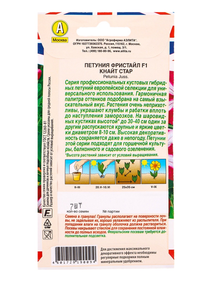 Производитель: Агрофирма АЭЛИТА; Габариты: 15 x 8 x 0,2; Страна: Россия; В боксе: 300 шт; Состав: См. на упаковке; Материалы: см. на упаковке; Фасовка: по 10 шт; Индивидуальная упаковка: Без упаковки; Сертификат: Не подлежит сертификации; Цвет: Красный, Белый; Вегетация: Однолетники; Вид: Петуния; Цветение период: Август, Июнь, Май, Сентябрь, Июль; Место выращивания: Подоконник, балкон, Открытый грунт; Сухоцвет: Нет; Махровые: Нет; Высота растений: 30-60 см; По форме куста: Кустовая; Назначение: Для создания цветников, клумбы; Отношение к свету: Светолюбивые; Разновидность: Цветущее