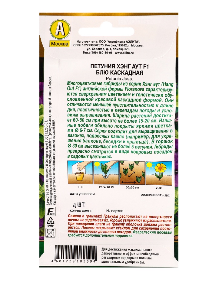 Производитель: Агрофирма АЭЛИТА; Габариты: 15 x 8 x 0,3; Страна: Гватемала; В боксе: 50 шт; Состав: См. на упаковке; Материалы: см. на упаковке; Фасовка: по 10 шт; Индивидуальная упаковка: Без упаковки; Сертификат: Не подлежит сертификации; Цвет: Синий; Вегетация: Однолетники; Вид: Петуния; Цветение период: Июнь, Сентябрь, Август, Июль, Май; Место выращивания: Открытый грунт, Подоконник, балкон; Сухоцвет: Нет; Махровые: Нет; Высота растений: До 30 см; По форме куста: Кустовая; Назначение: Для создания цветников, клумбы; Отношение к свету: Светолюбивые; Разновидность: Цветущее