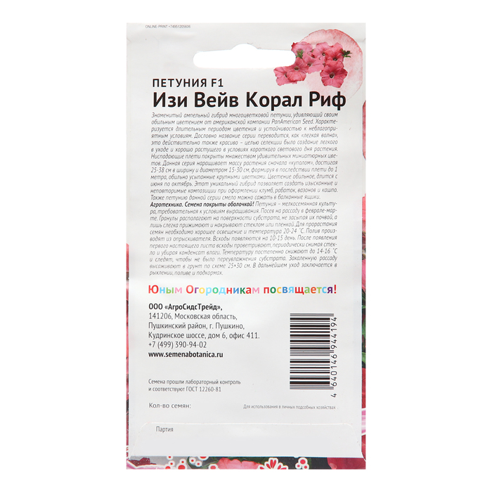 Производитель: Агросидстрейд; Габариты: 15 x 8 x 0,5; Страна: Коста-Рика; В боксе: 400 шт; Состав: Семена; Материалы: семена; Фасовка: по 10 шт; Индивидуальная упаковка: Без упаковки; Сертификат: Не подлежит сертификации; Цвет: Розовый; Агрономический срок годности, лет: 5; Вегетация: Однолетники; Вид: Петуния; Особенности выращивания: Открытый грунт; Сухоцвет: Нет; Махровые: Нет; По форме куста: Ампельная; Назначение: Для балкона, веранды; Отношение к свету: Светолюбивые; Разновидность: Цветущее; Нуждаются ли в стратификации: Нет