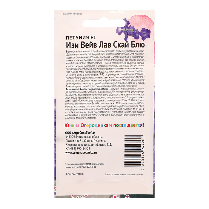 Производитель: Агросидстрейд; Габариты: 15 x 8 x 0,5; Страна: Коста-Рика; В боксе: 300 шт; Состав: Семена; Материалы: семена; Фасовка: по 10 шт; Индивидуальная упаковка: Без упаковки; Сертификат: Не подлежит сертификации; Цвет: Сиреневый; Агрономический срок годности, лет: 5; Вегетация: Однолетники; Вид: Петуния; Особенности выращивания: Открытый грунт; Сухоцвет: Нет; Махровые: Нет; По форме куста: Кустовая; Назначение: Для балкона, веранды, Для создания цветников, клумбы; Отношение к свету: Светолюбивые; Разновидность: Цветущее; Нуждаются ли в стратификации: Нет