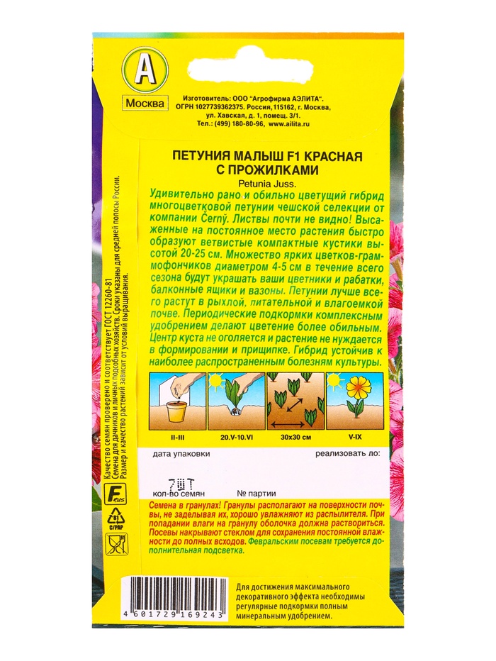 Производитель: Агрофирма АЭЛИТА; Габариты: 12 x 8 x 0,3; Страна: Чехия; В боксе: 110 шт; Состав: См. на упаковке; Материалы: см. на упаковке; Фасовка: по 10 шт; Индивидуальная упаковка: Без упаковки; Сертификат: Не подлежит сертификации; Вид: Петуния