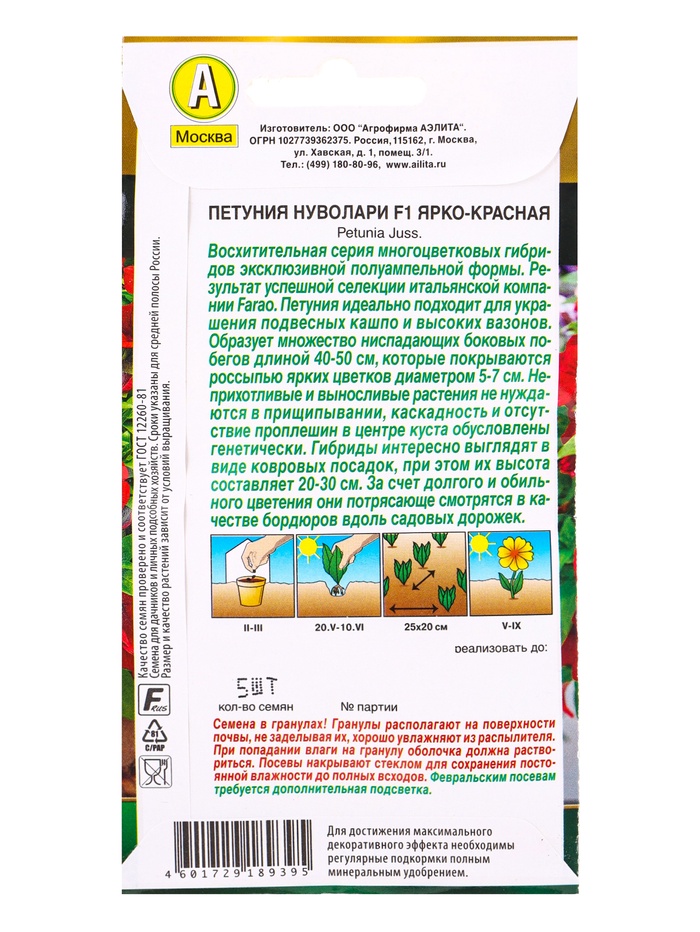 Производитель: Агрофирма АЭЛИТА; Габариты: 15 x 8 x 0,2; Страна: Россия; В боксе: 200 шт; Состав: См. на упаковке; Материалы: см. на упаковке; Фасовка: по 10 шт; Индивидуальная упаковка: Без упаковки; Сертификат: Не подлежит сертификации; Цвет: Красный; Вегетация: Однолетники; Вид: Петуния; Цветение период: Сентябрь, Июнь, Май, Август, Июль; Место выращивания: Подоконник, балкон, Открытый грунт; Сухоцвет: Нет; Махровые: Нет; Высота растений: 30-60 см; По форме куста: Кустовая; Назначение: Для создания цветников, клумбы; Отношение к свету: Светолюбивые; Разновидность: Цветущее