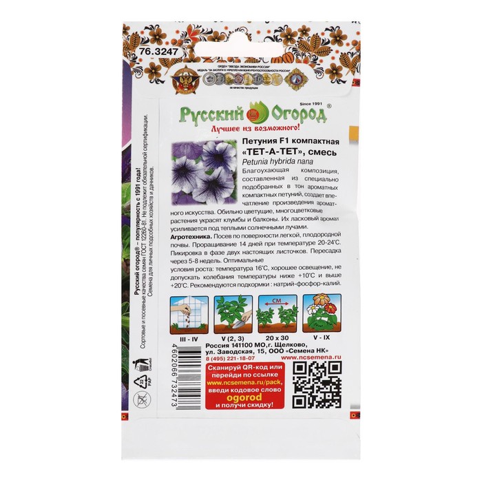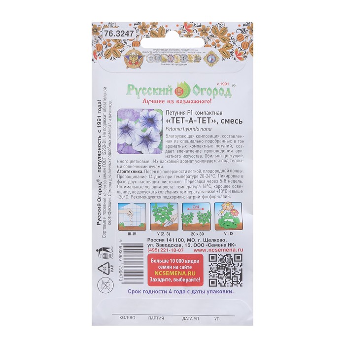 Производитель: Русский огород; Габариты: 15 x 8 x 0,3; Страна: Россия; В боксе: 100 шт; Состав: Семена; Материалы: семена; Фасовка: по 10 шт; Индивидуальная упаковка: Без упаковки; Сертификат: Не подлежит сертификации; Цвет: МИКС; Агрономический срок годности, лет: 3; Вегетация: Однолетники; Вид: Петуния; Особенности выращивания: Открытый грунт; Сухоцвет: Нет; Махровые: Нет; По форме куста: Кустовая; Назначение: Для создания цветников, клумбы, Для балкона, веранды; Отношение к свету: Светолюбивые; Разновидность: Цветущее; Нуждаются ли в стратификации: Нет