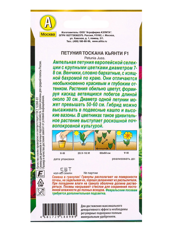 Производитель: Агрофирма АЭЛИТА; Габариты: 15 x 8 x 0,2; Страна: Россия; В боксе: 200 шт; Состав: См. на упаковке; Материалы: см. на упаковке; Фасовка: по 10 шт; Индивидуальная упаковка: Без упаковки; Сертификат: Не подлежит сертификации; Цвет: Розовый; Вегетация: Однолетники; Вид: Петуния; Цветение период: Июнь, Июль, Май, Август, Сентябрь; Место выращивания: Открытый грунт; Сухоцвет: Нет; Махровые: Нет; Высота растений: 30-60 см; По форме куста: Кустовая; Назначение: Для создания цветников, клумбы; Отношение к свету: Светолюбивые; Разновидность: Цветущее