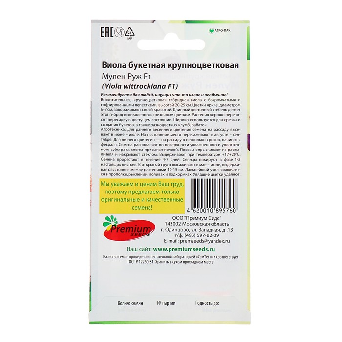 Производитель: Premium seeds; Габариты: 15 x 8 x 0,1; Страна: Россия; В боксе: 500 шт; Состав: См. на упаковке; Материалы: см. на упаковке; Фасовка: по 10 шт; Индивидуальная упаковка: Без упаковки; Сертификат: Не подлежит сертификации; Цвет: Разноцветный, МИКС; Высота, см: 20 - 25; Агрономический срок годности, лет: 3; Вегетация: Многолетники; Вид: Виола; Цветение период: Август, Июнь, Июль, Сентябрь; Упаковка: Цветная; Особенности выращивания: Открытый грунт; Сухоцвет: Нет; Махровые: Нет; По форме куста: Кустовая; Назначение: Для создания цветников, клумбы, Для балкона, веранды; Отношение к свету: Светолюбивые; Разновидность: Цветущее; Нуждаются ли в стратификации: Нет