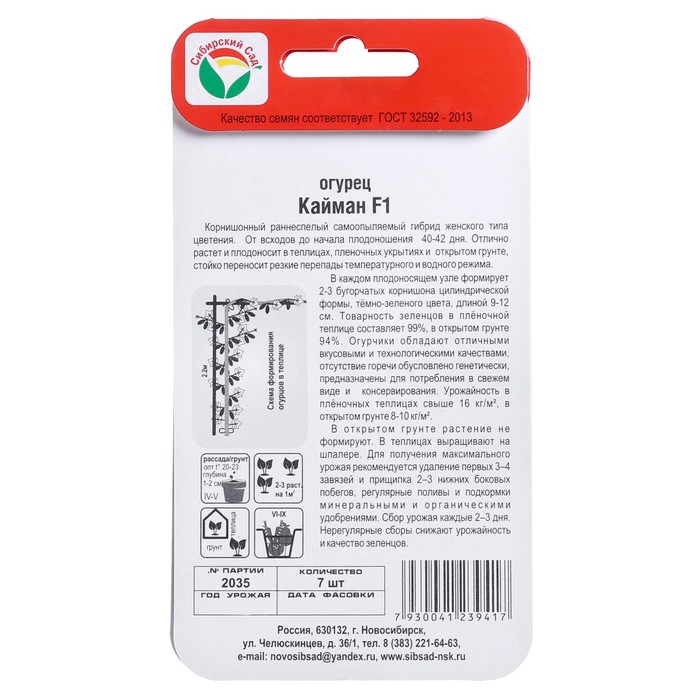 Производитель: Сибирский сад; Габариты: 14 x 8 x 0,2; Страна: Россия; В боксе: 300 шт; Состав: Семена; Материалы: семена; Фасовка: по 10 шт; Индивидуальная упаковка: Без упаковки; Сертификат: Не подлежит сертификации; Тип: Партенокарпические; Сроки созревания: Ранний; Упаковка: Цветная; Место выращивания: Закрытый грунт (теплицы, укрытия); Сорт или гибрид: Гибрид F1; Вегетационный период, дни: 40 - 42; Сорт: F1; Ампельные: Да; Вьющиеся (лианы): Да; Сроки созревания: Ранний ( до 48 дней); Размер: Корнишоны (до 12 см)