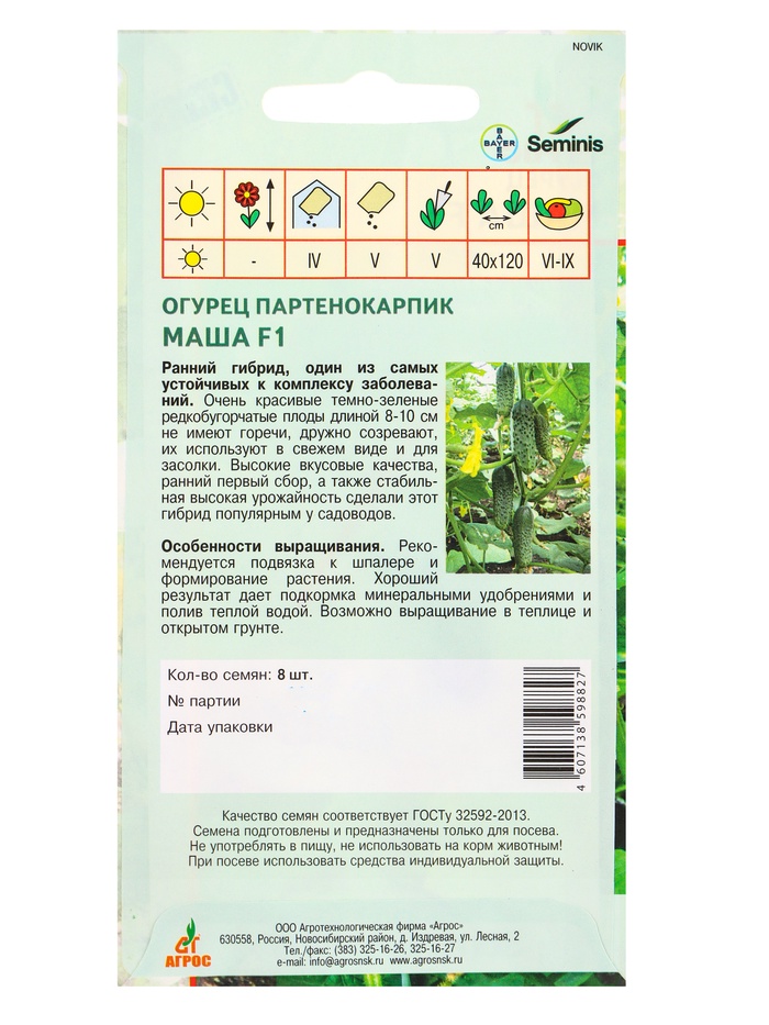 Производитель: Агросс; Габариты: 15 x 8 x 0,1; Страна: США; В боксе: 300 шт; Состав: См. на упаковке; Материалы: см. на упаковке; Фасовка: по 10 шт; Индивидуальная упаковка: Без упаковки; Сертификат: Не подлежит сертификации; Тип: Партенокарпические; Посев на рассаду: Апрель; Посев (посадка) в грунт: Май; Цветение период: Август, Июнь, Июль, Сентябрь; Место выращивания: Открытый грунт, Закрытый грунт (теплицы, укрытия); Сорт или гибрид: Сорт; Сроки созревания: Ранний ( до 48 дней); Размер: Корнишоны (до 12 см); Форма: Цилиндрическая; Применение: Универсальное; Урожайность, м²: 8 - 10; Тип поверхности: Крупнобугорчатый