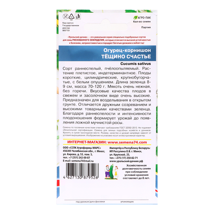 Производитель: Уральский Дачник; Габариты: 15 x 8 x 0,1; Страна: Россия; В боксе: 500 шт; Состав: Семена, см. на упаковке; Материалы: семена, см. на упаковке; Фасовка: по 1 шт; Индивидуальная упаковка: Без упаковки; Сертификат: Не подлежит сертификации; Тип: Пчёлоопыляемый; Сроки созревания: Средний; Посев на рассаду: Апрель, Март; Посев (посадка) в грунт: Май, Июнь; Место выращивания: Универсальный; Сорт или гибрид: Сорт; Сорт: Тещино счастье; Сроки созревания: Ранний ( до 48 дней); Размер: Корнишоны (до 12 см); Форма: Цилиндрическая; Применение: Универсальное; Тип поверхности: Крупнобугорчатый
