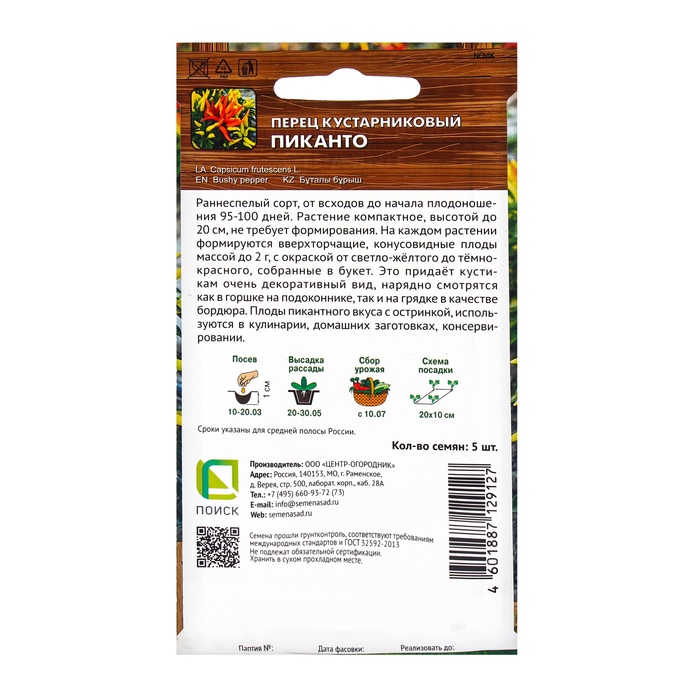 Производитель: ПОИСК; Габариты: 15 x 8 x 0,1; Доставка: Платная; Страна: Китай; В боксе: 200 шт; Состав: Семена; Материалы: семена; Фасовка: по 10 шт; Индивидуальная упаковка: Без упаковки; Сертификат: Не подлежит сертификации; Цвет: Красный; Количество семян, шт: 5; Сроки созревания: Ранний; Вкус: Острый; Посев на рассаду: Март; Посев (посадка) в грунт: Май; Место выращивания: Открытый грунт, Подоконник, балкон, Комнатное выращивание; Сорт или гибрид: Сорт; Вид: Простые семена; Толстостенный тип: Нет; Высота: Среднерослые (50-70 см); Вес: Мелкоплодные (до 100 г)