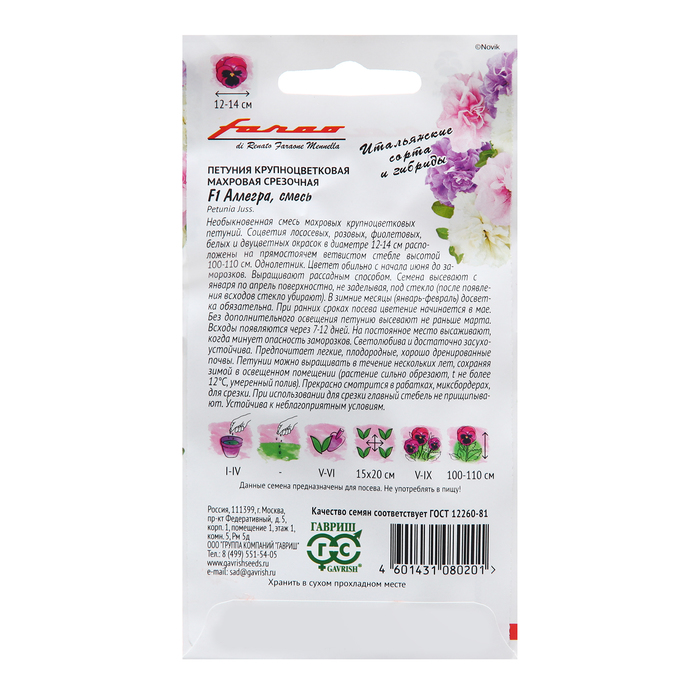 Производитель: Гавриш; Габариты: 15 x 8 x 0,2; Страна: Россия; В боксе: 100 шт; Состав: Семена; Материалы: семена; Фасовка: по 10 шт; Индивидуальная упаковка: Без упаковки; Сертификат: Не подлежит сертификации; Цвет: МИКС; Агрономический срок годности, лет: 5; Вегетация: Однолетники; Вид: Петуния; Особенности выращивания: Открытый грунт; Сухоцвет: Нет; Махровые: Нет; По форме куста: Кустовая; Назначение: Для балкона, веранды, Для создания цветников, клумбы; Отношение к свету: Светолюбивые; Разновидность: Цветущее; Нуждаются ли в стратификации: Нет