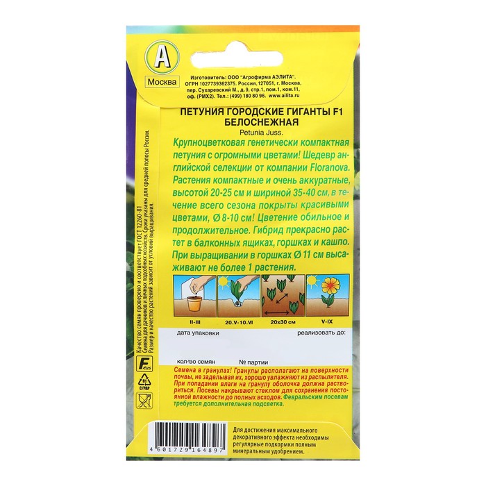 Производитель: Агрофирма АЭЛИТА; Габариты: 15 x 8 x 0,5; Страна: Индия; В боксе: 300 шт; Состав: См. на упаковке; Материалы: см. на упаковке; Фасовка: по 10 шт; Сертификат: Не подлежит сертификации; Цвет: Белый; Агрономический срок годности, лет: 5; Вегетация: Однолетники; Вид: Петуния; Особенности выращивания: Открытый грунт; Сухоцвет: Нет; Махровые: Нет; По форме куста: Кустовая; Назначение: Для создания цветников, клумбы, Для балкона, веранды; Отношение к свету: Светолюбивые; Разновидность: Цветущее; Нуждаются ли в стратификации: Нет