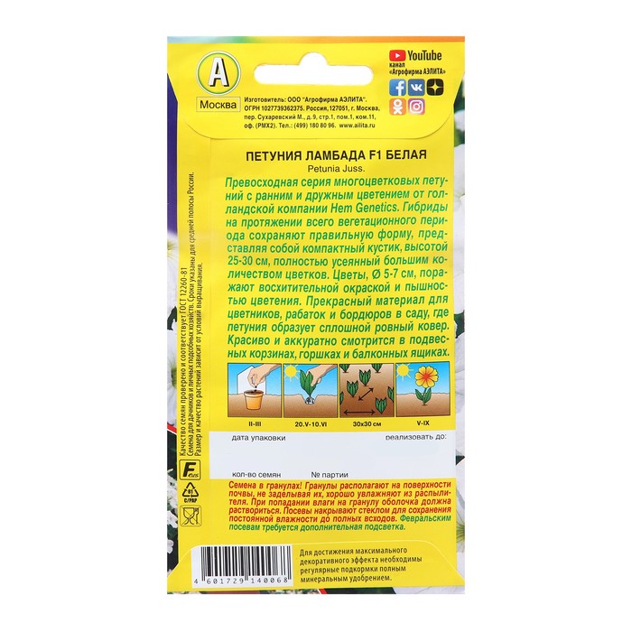 Производитель: Агрофирма АЭЛИТА; Габариты: 15 x 8 x 0,5; Страна: Индонезия; В боксе: 400 шт; Состав: См. на упаковке; Материалы: см. на упаковке; Фасовка: по 10 шт; Сертификат: Не подлежит сертификации; Цвет: Белый; Агрономический срок годности, лет: 5; Вегетация: Однолетники; Вид: Петуния; Особенности выращивания: Открытый грунт; Сухоцвет: Нет; Махровые: Нет; По форме куста: Кустовая; Назначение: Для создания цветников, клумбы, Для балкона, веранды; Отношение к свету: Светолюбивые; Разновидность: Цветущее; Нуждаются ли в стратификации: Нет