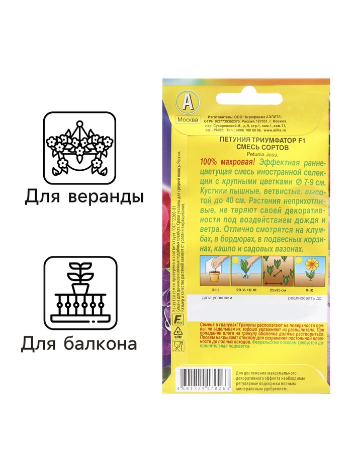 Производитель: Агрофирма АЭЛИТА; Габариты: 15 x 8 x 0,4; Страна: США; В боксе: 500 шт; Состав: См. на упаковке; Материалы: см. на упаковке; Фасовка: по 10 шт; Индивидуальная упаковка: Без упаковки; Сертификат: Не подлежит сертификации; Цвет: МИКС; Агрономический срок годности, лет: 5; Вегетация: Однолетники; Вид: Петуния; Особенности выращивания: Открытый грунт; Сухоцвет: Нет; Махровые: Нет; По форме куста: Кустовая; Назначение: Для создания цветников, клумбы, Для балкона, веранды; Отношение к свету: Светолюбивые; Разновидность: Цветущее; Нуждаются ли в стратификации: Нет