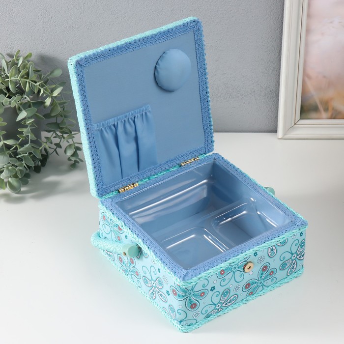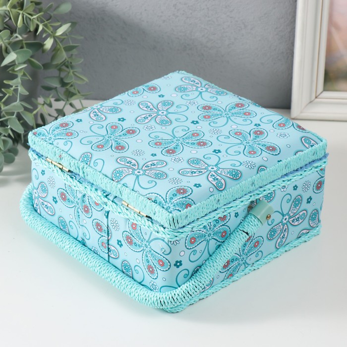 Габариты: 23 x 23 x 11,5; Страна: Китай; В боксе: 6 шт; Состав: PVC, дерево, текстиль; Материалы: PVC, дерево, текстиль; Фасовка: по 1 шт; Индивидуальная упаковка: Пакет; Габариты товара: 20 см × 20 см × 11 см; Сертификат: ЕАС; Цвет: Голубой; Форма: Прямоугольная; Длина, см: 20; Ширина, см: 20; Высота, см: 11; Количество секций: 4; Тематика: Бабочки, Цветочно-растительная; Тематика праздника: 8 Марта, Универсальная тематика; Материал: Дерево, Текстиль; Покрытие: Текстиль; Особенности шкатулки: С делениями, Для рукоделия, С ручкой; Особенности: Многоуровневый, Передвижные ячейки