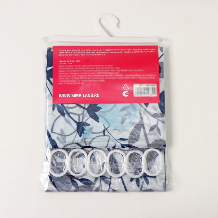 Производитель: Доляна; Габариты: 29 x 24 x 2; Страна: Китай; В боксе: 72 шт; Состав: EVA; Материалы: EVA; Фасовка: по 1 шт; Индивидуальная упаковка: Пакет; Габариты товара: 180 см × 180 см × 0,1 см; Сертификат: СТР; Цвет: Белый, Голубой; Размер, см: 180 х 180; Тематика: Цветочно-растительная; Рисунок: Да; Материал: EVA; Тип крепления: Кольца; Кольца в комплекте: Да