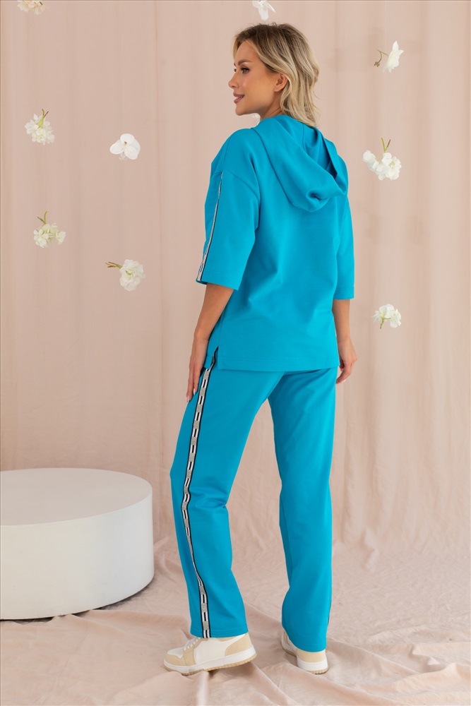 Симпатичный женский костюм от компании Valentina. Модель выполнена из Турецкого трикотажа "футер - двунитка" в лазурном цвете, состоит из брюк и футболки. Футболка прямого силуэта с капюшоном. Короткий рукав со спущенным плечом. Низ ровный, по бокам разрезы. Брюки с комфортной посадкой на талии которую обеспечивает притачной пояс на резинке. В боковых швах функциональные карманы. По бокам настроченные лампасы. Модель прекрасно подойдет для прогулок и активного отдыха. Рекомендуемая стирка при t не более 30°., Оттенок цвета может незначительно отличаться от фото., Ожидание отправки (рабочих дней): 8, Длина: футболка: 67 см; брюк по шаговому шву: 77 см., Размер модели: 42., Рост модели: 168 см., Состав:, Хлопок 95%, Эластан 5%, Тип ткани:, Трикотаж