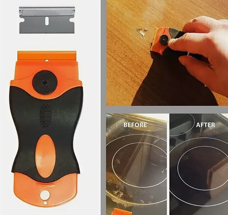Скребок для варочной панели стеклокерамики и индукции станет вашим верным помощником не только на кухне, но и во всем доме. Он отлично справляется с засохшими, застарелыми и пригоревшими загрязнениями на кафеле, кухонном фартуке, стекле, окне и в духовке. Скребок с лезвиями специально разработан для чистки керамической плиты и кафельных поверхностей. С помощью нашего универсального скребка для чистки электрической и газовой плиты вы сможете легко и без применения бытовой химии устранить даже самые сложные загрязнения. Благодаря острым лезвиям, он проникает в самые труднодоступные места и с легкостью удаляет стойкие пятна и остатки пищи. Особенностью кухонного скребка является его многофункциональность. Он идеально подойдет для очистки окон от скотча и краски, стекла аквариума и автомобиля от тонировки и наклеек. А также его используют как скребок малярный и штукатурный при строительных и монтажных работах. В комплекте вы получаете запасные 2 лезвия ( плюс одно лезвие сразу на скребке, итого 3 лезвия), что позволит вам использовать его долгое время без необходимости покупать новые. Размеры: 11* 4 см Комментарии к товару