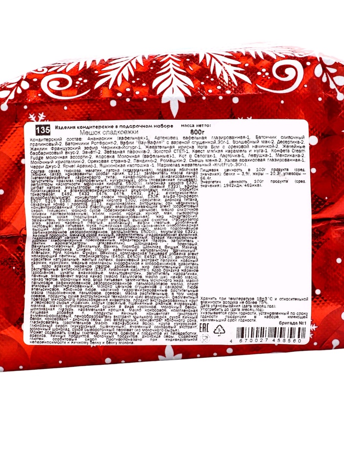 Габариты: 18 x 11 x 40; Страна: Россия; В боксе: 6 шт; Состав: См. на упаковке; Материалы: см. на упаковке; Фасовка: по 1 шт; Индивидуальная упаковка: Мешок; Сертификат: ЕАС; Цвет: МИКС; Для кого: Унисекс; В наборе, шт.: 46; Вес нетто, г: 800; Вид упаковки: Тканевый мешок; Тематика праздника: Новый год, Рождество; Адресат: Девочке, Мальчику; Составляющие набора: Конфеты; Возраст: Для детей